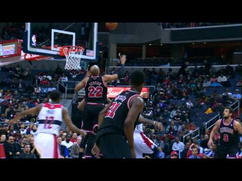 Check out this wild play from Washington, D.C. as Kevin Seraphin misses the jumper and the rebound comes off the basket hard and is tipped straight up in the air by Bulls forward Taj Gibson & somehow goes right in the basket, much to the delight of Wizards forward Trevor Booker!
