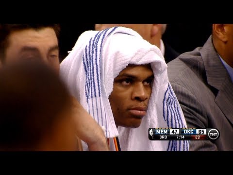 | Russell Westbrook thought he had a huge mismatch when Jerryd Bayless switched onto him. He received a 5 second backdown penalty during the game, resulting in one of his five turnovers. From there he argued with teammate Thabo Sefolosha and was pulled from the game by coach Scott Brooks. Westbrook then stood outside of the huddle during a timeout, threw a tantrum on the Thunder bench, then stormed off into the locker room. He then came back out, but with a towel over his head.
